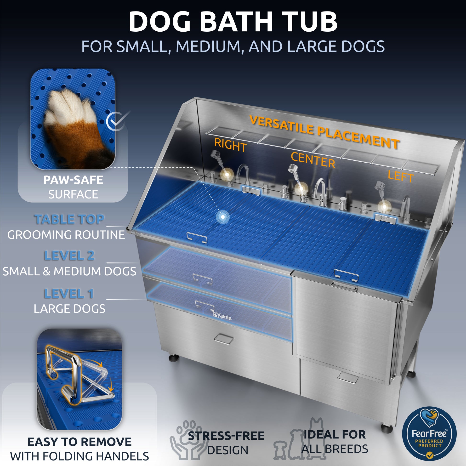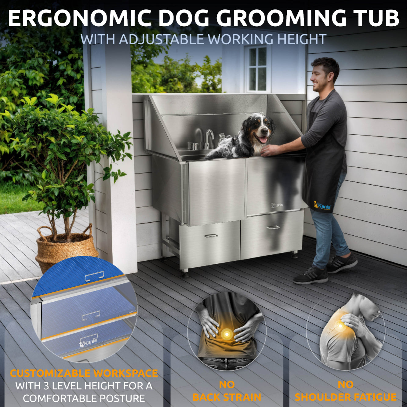 INNOVATIVE FEATURES - Designed for strength and durability, The High-Quality Dog Tub for Grooming is equipped with Ramp-Door / Functional Faucet with Pull Out Dog Shower Head / Soap Dispenser / Hair trap / Drain Kit / Two-piece, Removable Floor Grate / Bathtub Backsplash and Storage Drawer.